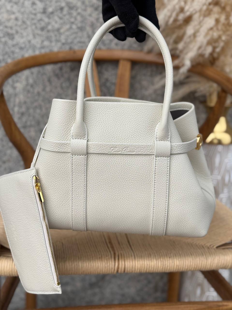 أناقة هادئة بأعلى مستوى: حقيبة جلد محبّب (Pebbled) بتصميم مينيمال راقٍ مع تفصيلة “الحزام” الأمامية ولمعة معدنية ذهبية فخمة—تكمّل أي إطلالة بدون مبالغة.
