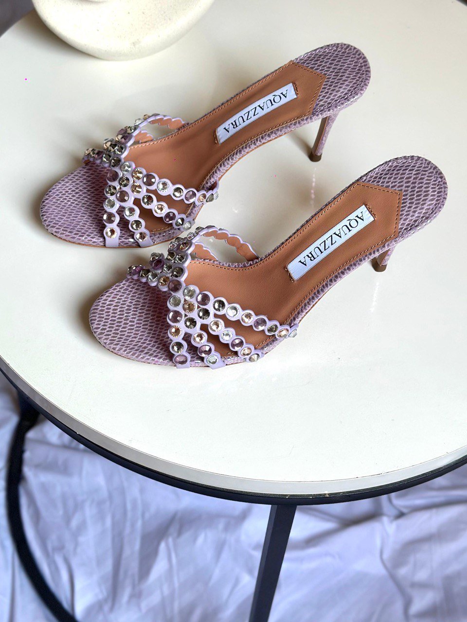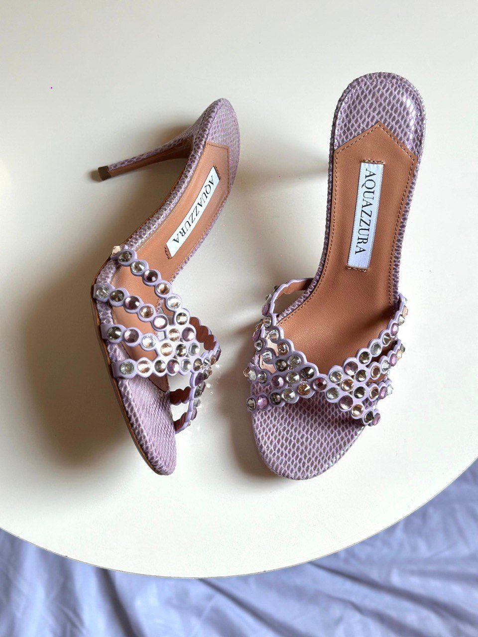 لون ناعم ومميز يطلع “ستايل” بدون مجهود. نقش السنيك يعطي فخامة مختلفة، والكريستال يضيف لمعة راقية — مناسب للنهار الراقي أو سهرات خفيفة.