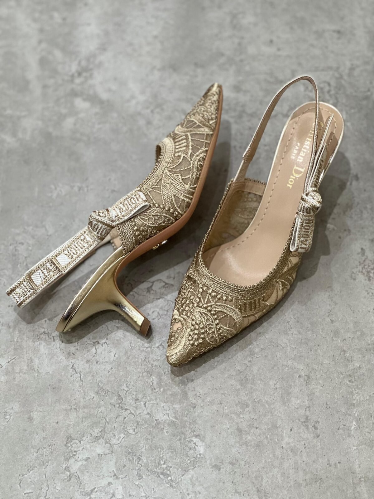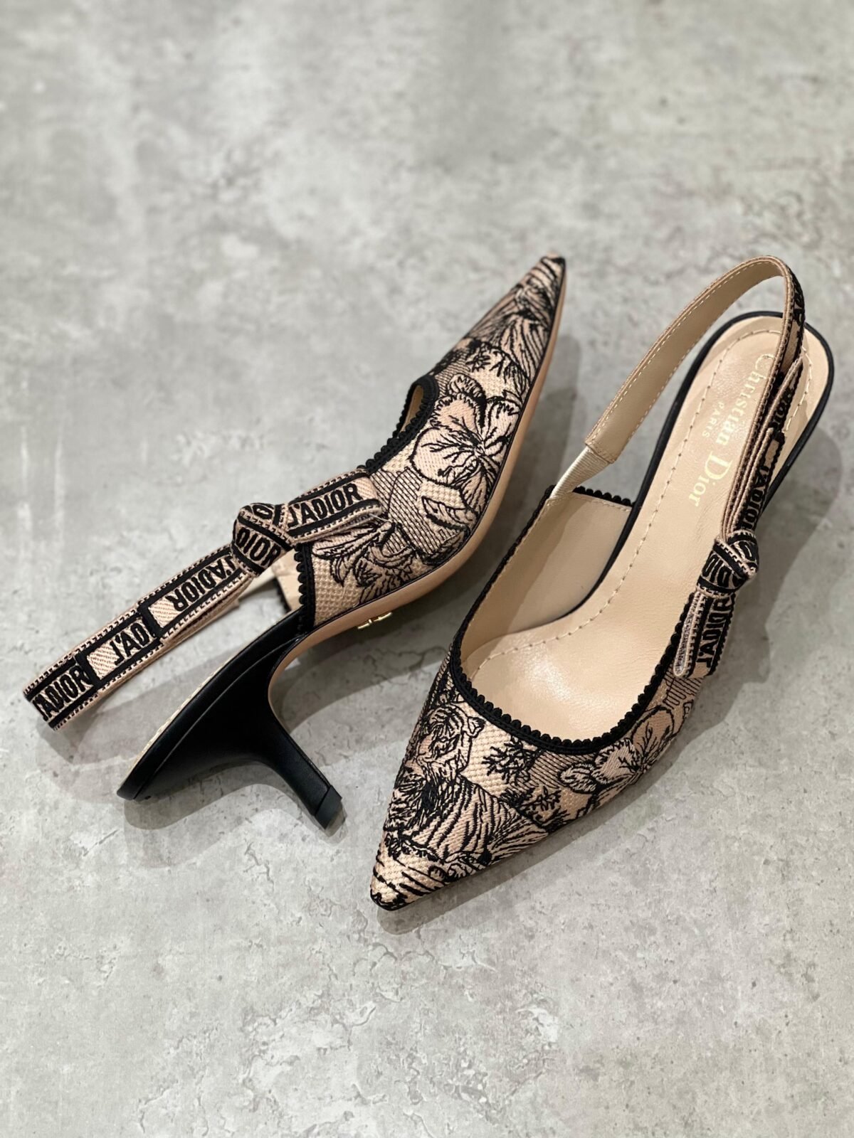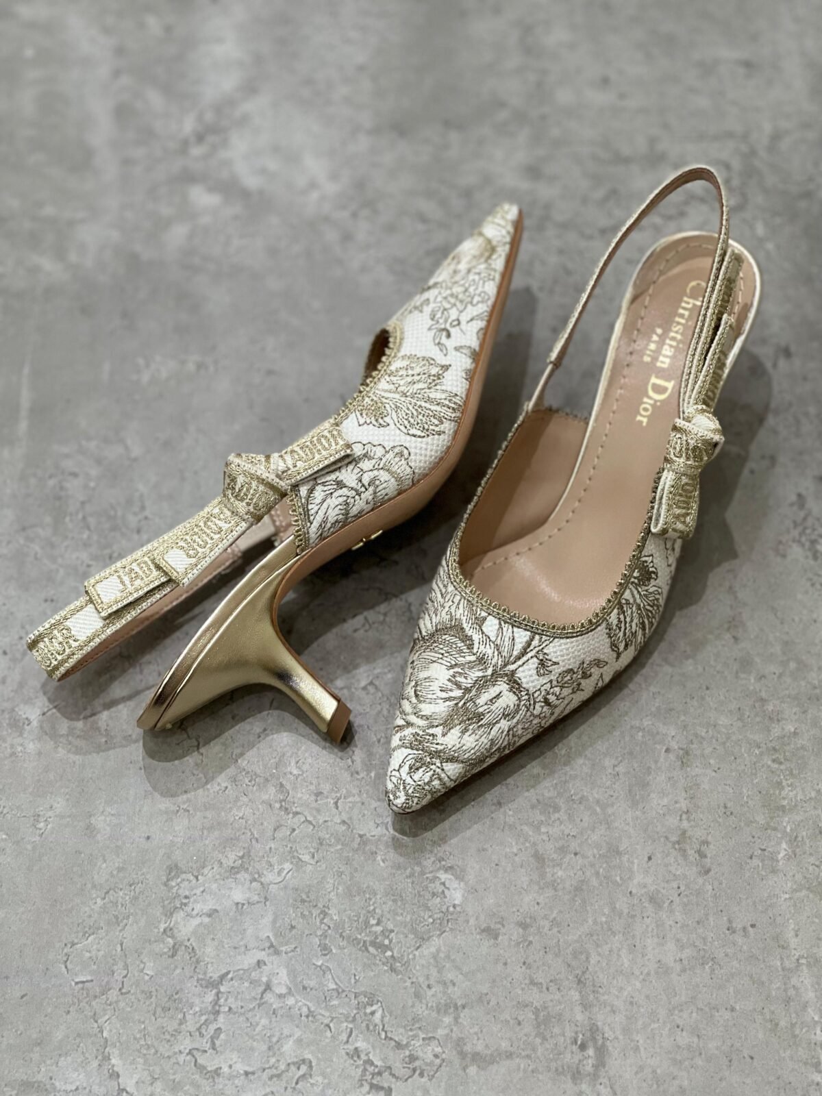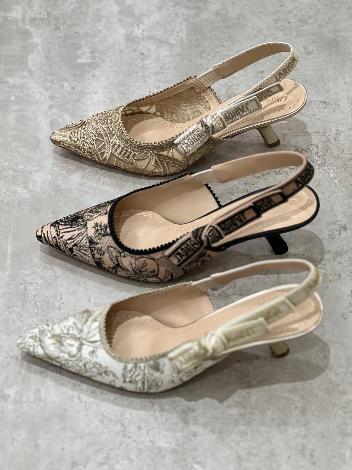 حذاء سلاينغ-باك بكعب قصير مريح وتصميم مدبّب أنيق، مع تطريز فاخر وحزام مميز. متوفر بثلاث لمسات راقية: ذهبي مطرز للسهرات، أسود بنقشة فاتحة لإطلالة كلاسيكية، وأوف وايت/عاجي بنقشة ناعمة لستايل يومي أنثوي.
