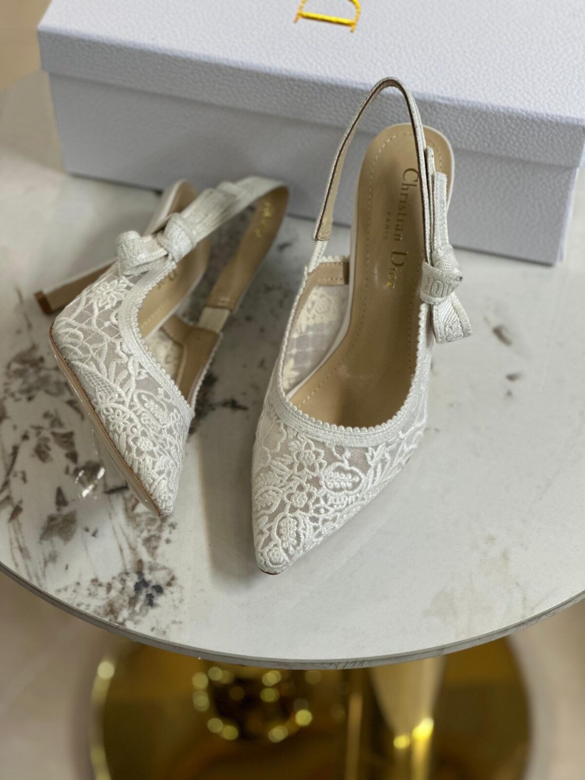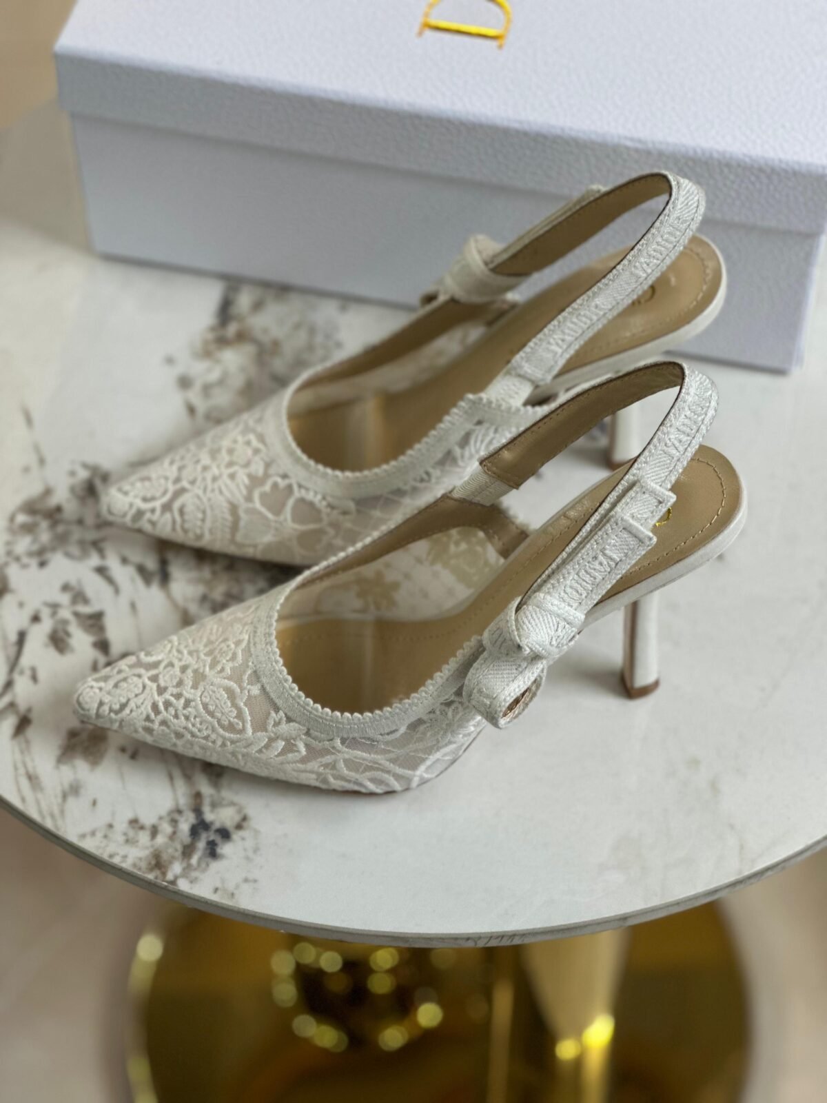 حذاء سيلينغ باك بكعب أنيق ودانتيل فخم باللون العاجي/الأبيض الراقي لمظهر ناعم ومناسب للمناسبات والعرائس.