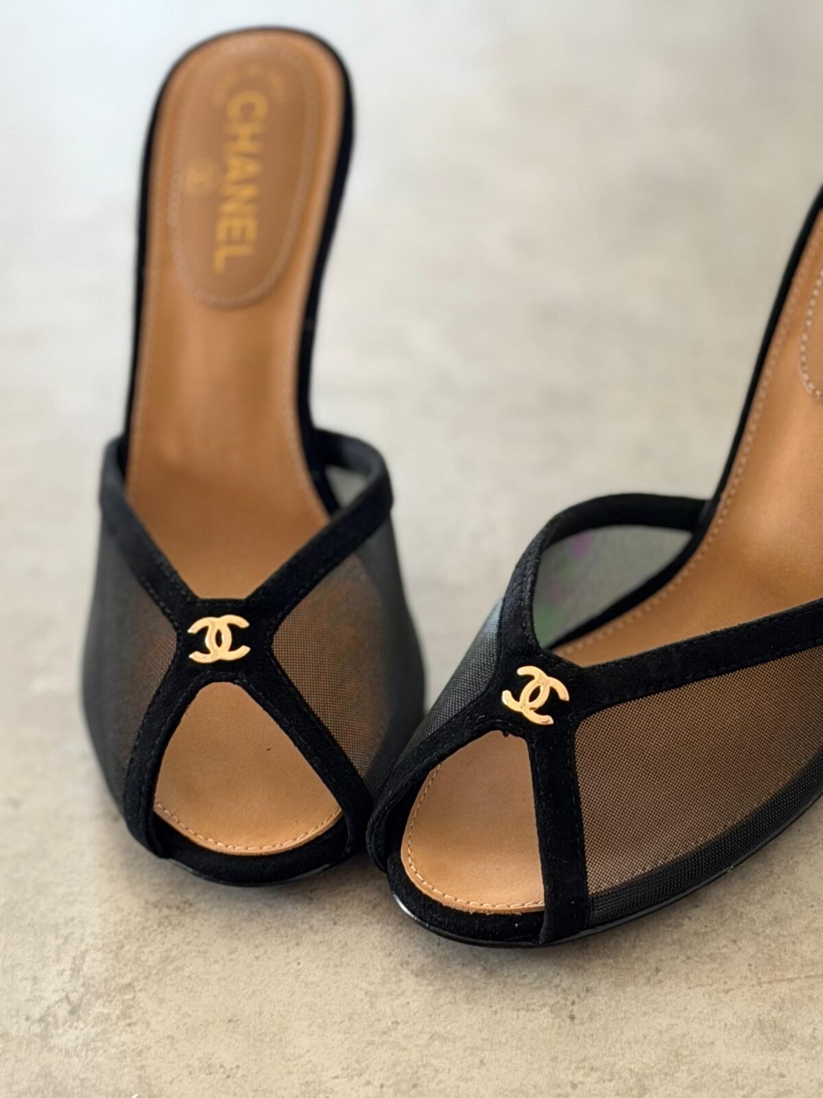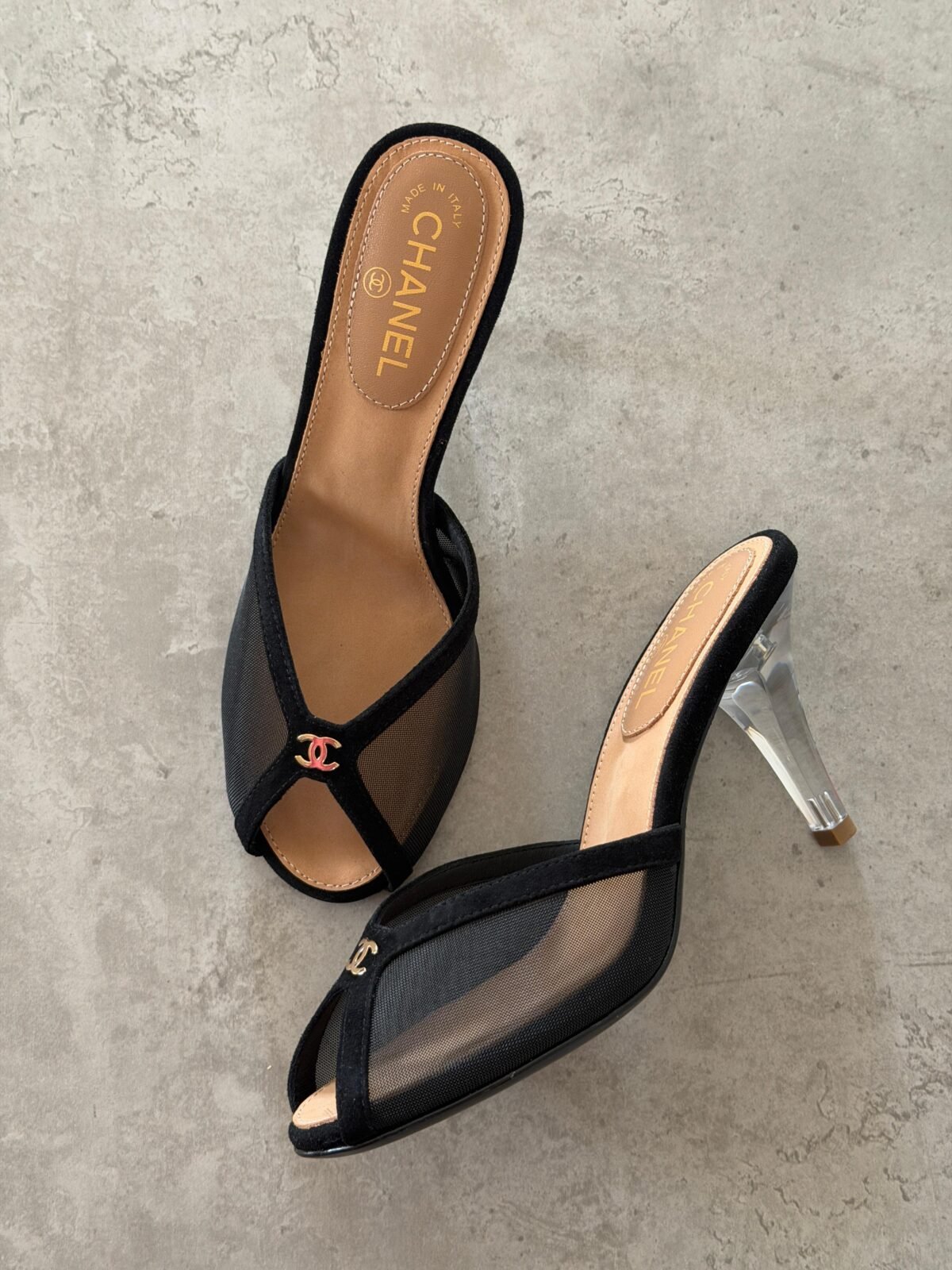 حذاء ميوول أنيق بتصميم شبك خفيف مع حواف مخملية ناعمة ولمسة شعار ذهبي في المقدمة وفتحة أمامية .