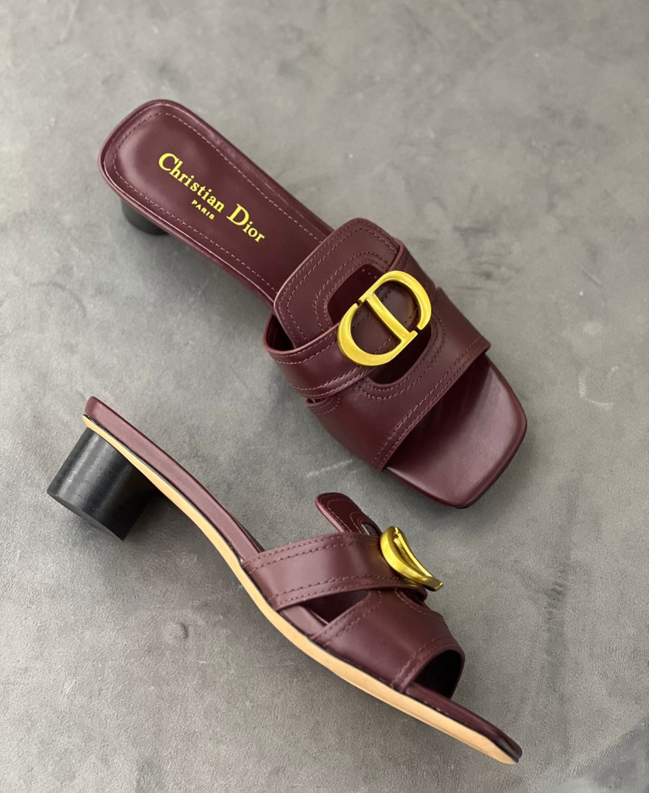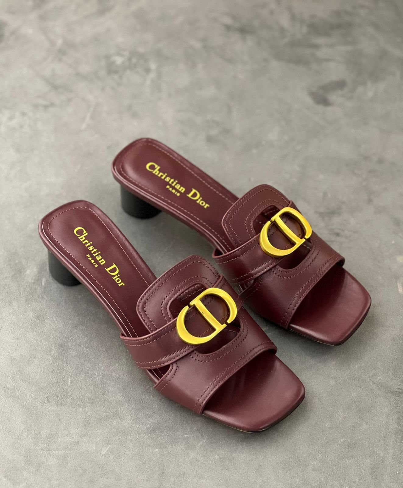 سلايد هييلد جلد بلون عنابي فاخر مع بكلة CD ذهبية وكعب متوسط مريح—لمسة أنيقة تناسب السهرات والإطلالات الرسمية.