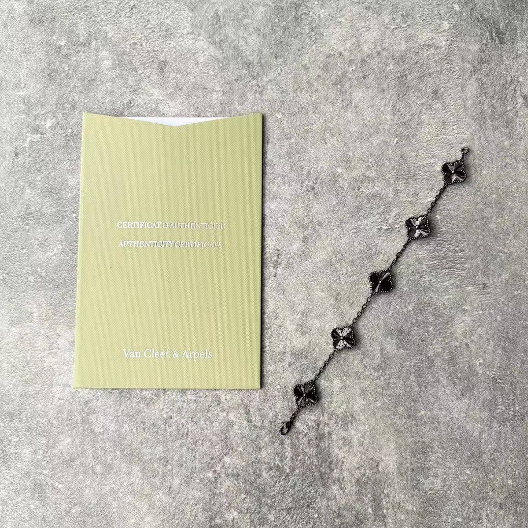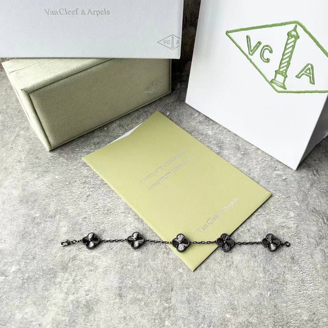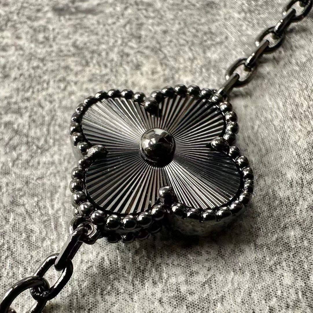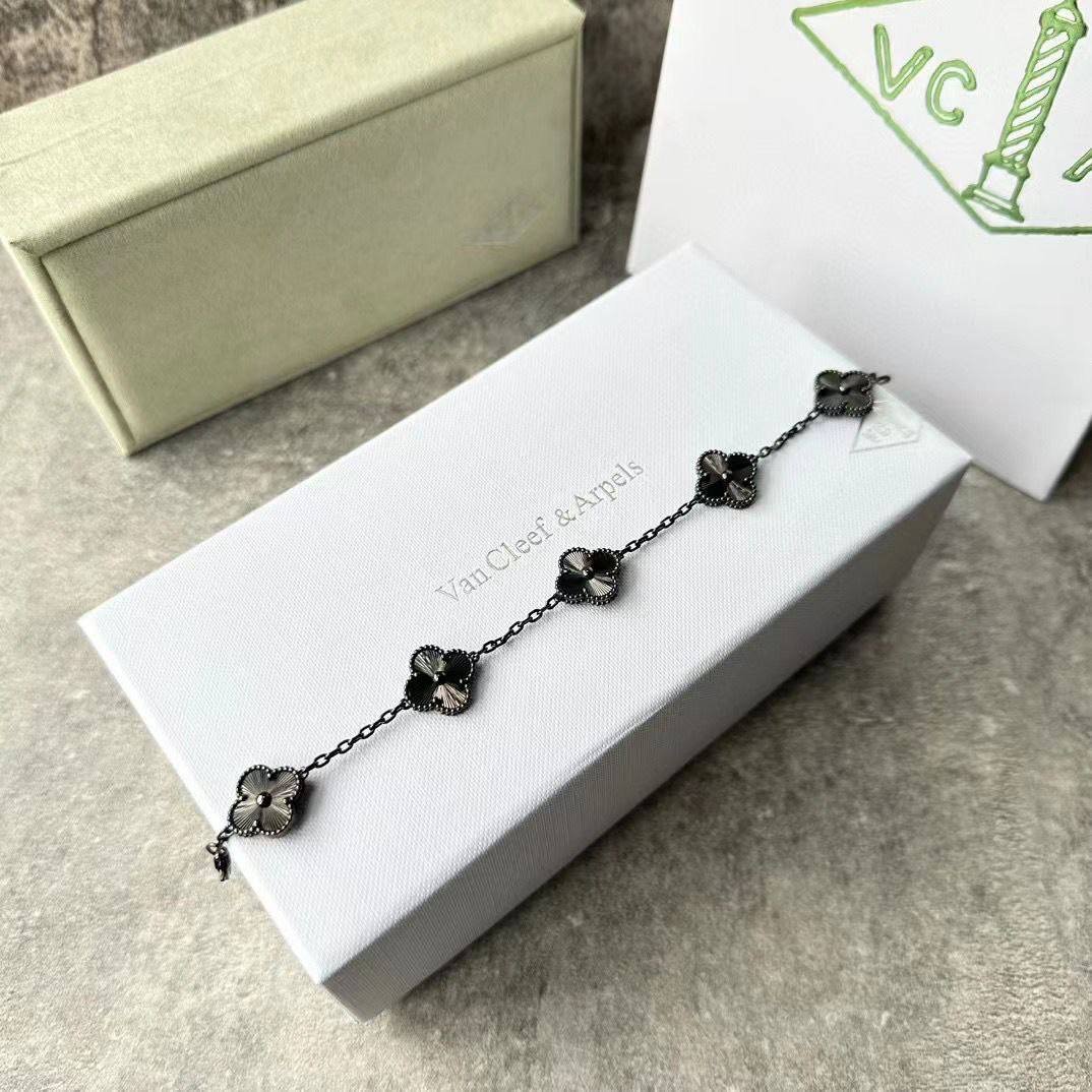 سوار ألهامبرا خماسي بتصميم البرسيم الأيقوني على سلسلة رفيعة ولمسة داكنة فاخرة، يضيف أناقة ناعمة لليوم والسهرة ومناسب للهدايا والتكديس مع أساور أخرى.