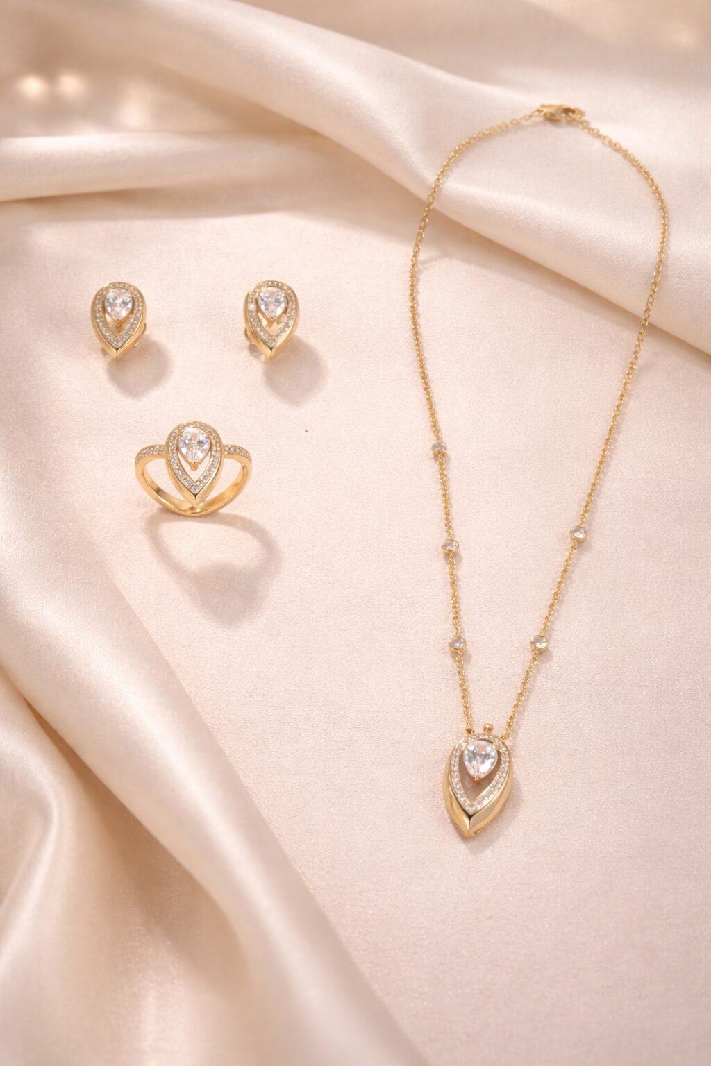 طقم مجوهرات بتصميم أنيق مستوحى من الذوق العالمي، مطلي بعناية ليمنحك لمسة فاخرة تناسب الإطلالات اليومية والمناسبات الخاصة. خيار مثالي لعشّاق الأناقة والتفاصيل الراقية.