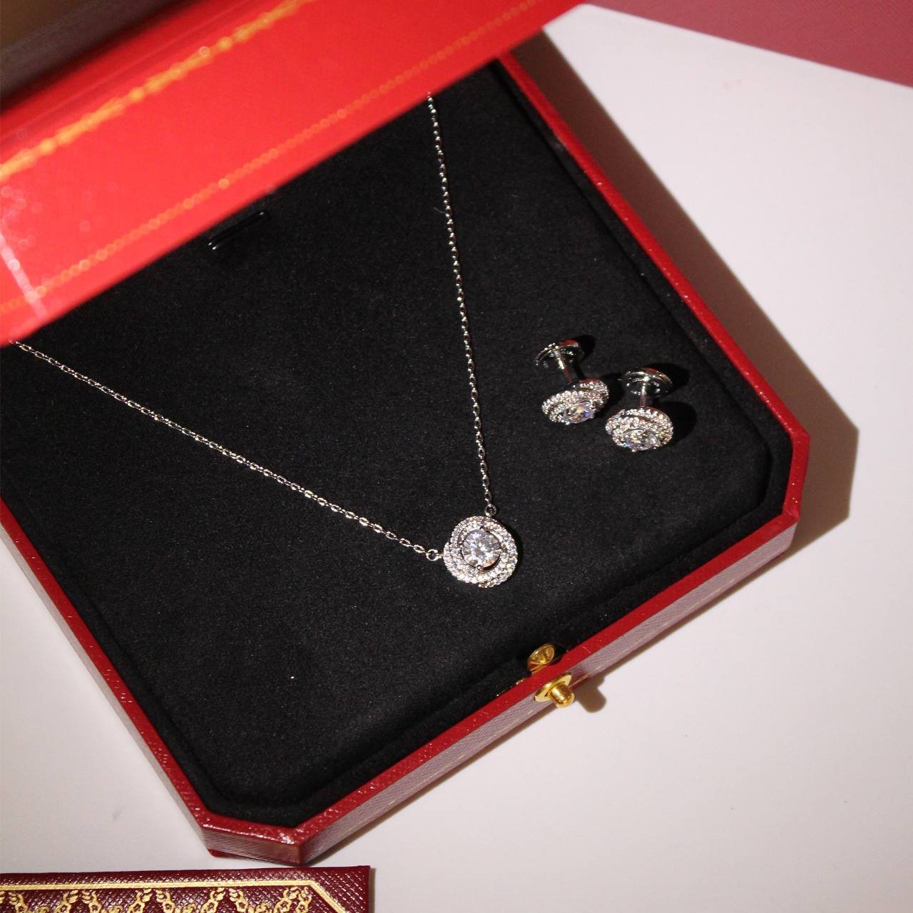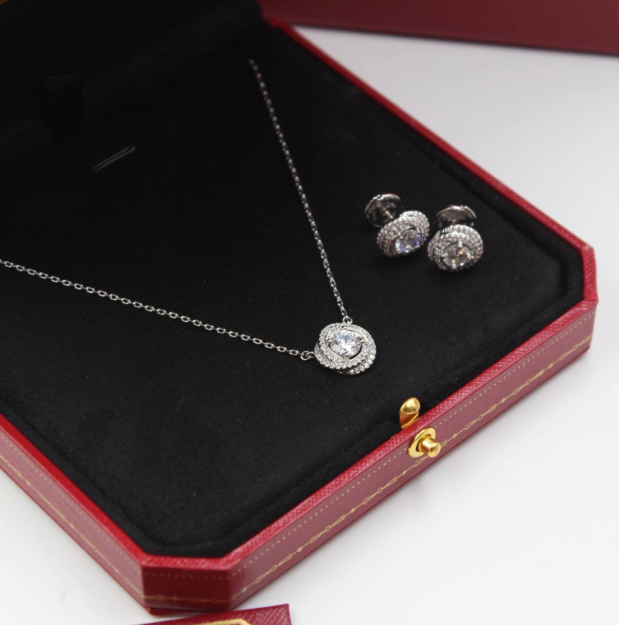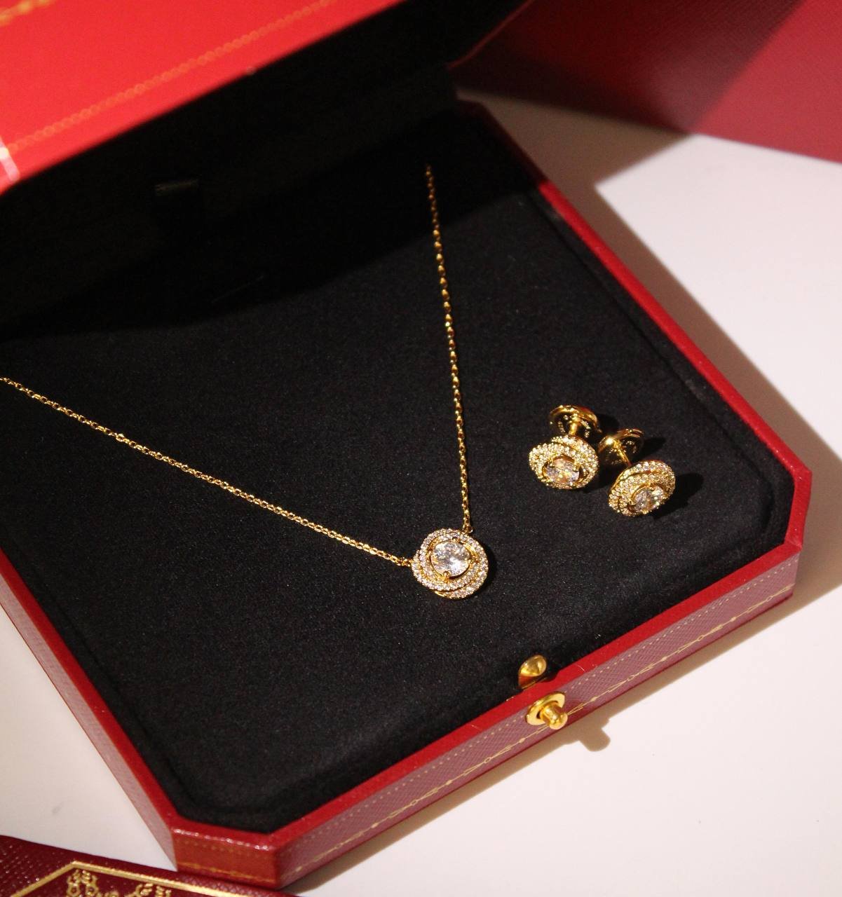 طقم هالو أنيق بلمسة ذهبية مع حجر مركزي لامع وإطار مرصّع بفصوص دقيقة. يتكوّن من عقد مع أقراط متناسقة—مثالي للمناسبات والهدية ويمنح إطلالة راقية وبريقًا ناعمًا.