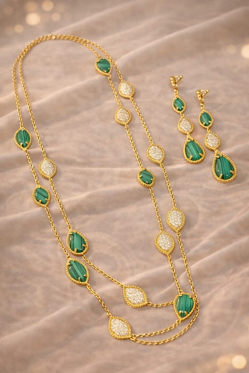 طقم مجوهرات بتصميم أنيق مستوحى من الذوق العالمي، مطلي بعناية ليمنحك لمسة فاخرة تناسب الإطلالات اليومية والمناسبات الخاصة. خيار مثالي لعشّاق الأناقة والتفاصيل الراقية.