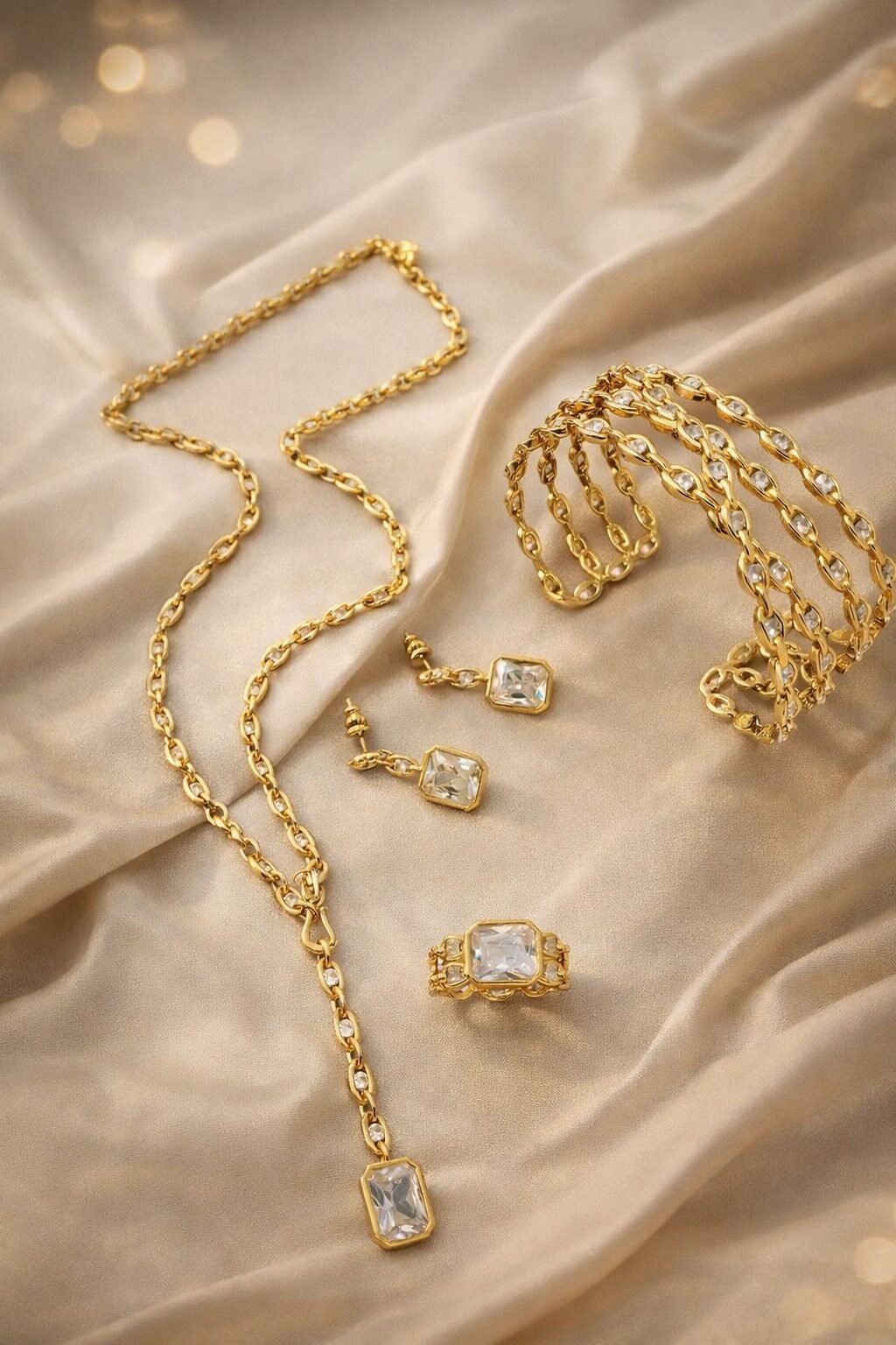 طقم مجوهرات بتصميم أنيق مستوحى من الذوق العالمي، مطلي بعناية ليمنحك لمسة فاخرة تناسب الإطلالات اليومية والمناسبات الخاصة. خيار مثالي لعشّاق الأناقة والتفاصيل الراقية.