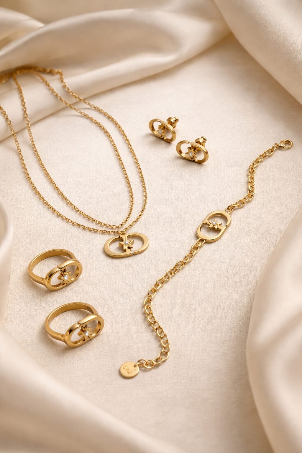 طقم مجوهرات بتصميم أنيق مستوحى من الذوق العالمي، مطلي بعناية ليمنحك لمسة فاخرة تناسب الإطلالات اليومية والمناسبات الخاصة. خيار مثالي لعشّاق الأناقة والتفاصيل الراقية.