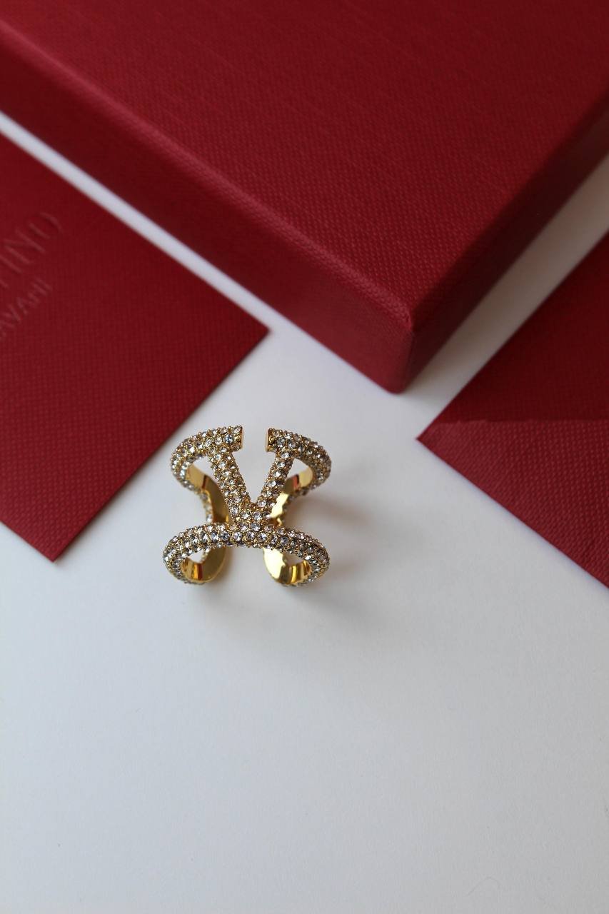 خاتم بتصميم V Signature مرصّع بكريستالات بافيه لامعة ولمسة فاخرة ملفتة. قطعة ستايتمنت أنيقة للمناسبات، مثالية كهدية وتنسيقها سهل مع الإطلالات اليومية والسهرة.